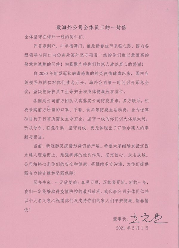 當(dāng)前,新冠肺炎疫情形勢仍然嚴峻。希望大家繼續(xù)發(fā)揚江西水建人迎難而上、頑強拼搏的優(yōu)良作風(fēng),堅定信心,眾志成城。公司始終心系你們的安全和健康,將繼續(xù)多方溝通,為你們提供強有力的支撐和堅強保障!