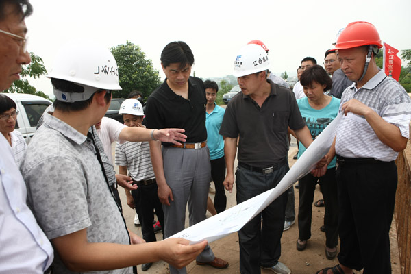 孫曉山廳長(zhǎng)一行深入查看了樟山庫(kù)區(qū)防護(hù)工程的施工現(xiàn)場(chǎng),并認(rèn)真聽取了我公司項(xiàng)目經(jīng)理彭紅軍對(duì)工程整體布置、進(jìn)度及工程施工中遇到的困難和問題等的簡(jiǎn)要匯報(bào)。樟山防護(hù)工程施工戰(zhàn)線長(zhǎng)、作業(yè)難度大、牽涉的范圍點(diǎn)多面廣,是峽江水利樞紐庫(kù)區(qū)防護(hù)工程施工難度最大的項(xiàng)目之一,孫廳長(zhǎng)對(duì)工程進(jìn)展情況非常關(guān)心。聽取匯報(bào)后,孫廳長(zhǎng)指出:一是要做好民生工程,做好移民、征地、拆遷等工作,為工程施工提供便利;二是要爭(zhēng)取早日施工,在早稻收割完成后立即進(jìn)行工程施工,確保工程于明年7月份完成主體工程;三要合理安排施工工期,確保峽江水利樞紐蓄水及第一臺(tái)發(fā)電機(jī)組按期發(fā)電。