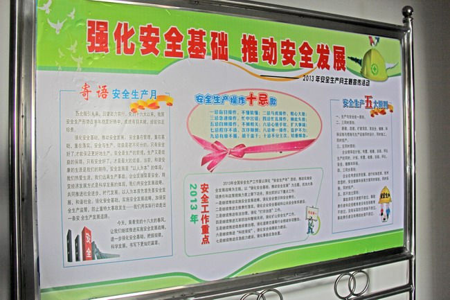 按照2013年“安全生產(chǎn)月”活動實施方案要求,公司所屬各單位張貼、懸掛安全生產(chǎn)警示語,突出宣傳“強化安全基礎(chǔ),推動安全發(fā)展”的活動主題。