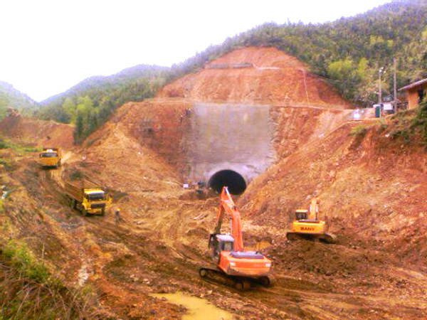 高倚四級水電站位于遂川江北支江高倚段,壩址座落在江西省遂川縣大坑鄉(xiāng),是贛江水系一級支流遂川江北支流梯級開發(fā)電站群中的一座。該水電站是一座以水力發(fā)電為主的低壩引水式小型水電站工程,安裝3臺軸流定槳立式水輪發(fā)電機組,總裝機容量7500千瓦,多年平均發(fā)電量2466萬千瓦時。水庫正常蓄水位134.5米,總庫容224.3萬立方米,主要由擋水壩建筑物、引水建筑物、廠房建筑物、防護工程及并網(wǎng)輸電線路五部分組成,為小(Ⅰ)型水電站工程,工程等別為Ⅳ等。大壩壩軸線總長269米,引水隧洞總長1414.9米,隧洞為無壓城門形斷面,開挖斷面達60平方米(屬超大型斷面),引水隧洞進口支洞長度42米。