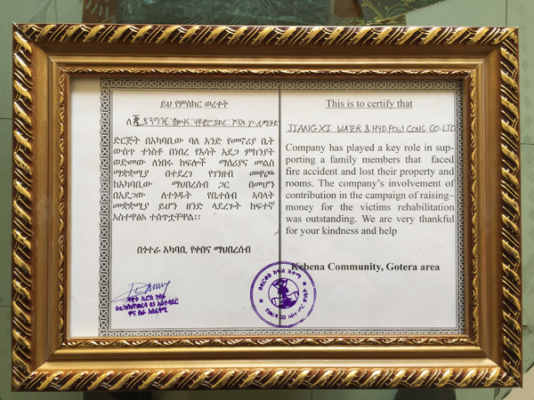 近期,在我辦事處所在地社區(qū)居民Alemayehu Bekele家不幸遭遇無(wú)情火災(zāi)、家庭陷入極度困境的時(shí)刻,江西水建駐埃分公司向其伸出援手,助其迅速重建家園。事后,Gotera社區(qū)協(xié)調(diào)員及警察所官員一行為我公司這種義舉表示贊賞并頒發(fā)了感謝證證書。
