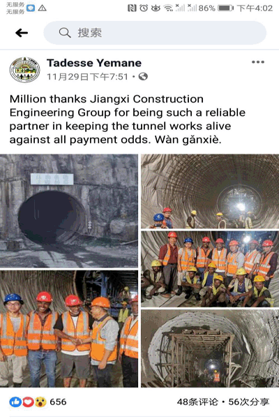參觀結(jié)束時,Tadesse先生由衷感謝大家的辛勤付出,對項目部順利完成隧洞首倉襯砌砼表示高度贊許,并相信項目部一定能保質(zhì)保量完成隧洞二期襯砌施工。Tadesse先生還在Facebook(臉書)平臺分享了本次隧洞參觀的經(jīng)歷,并表達(dá)了對我公司作為戰(zhàn)略合作伙伴的充分信任。