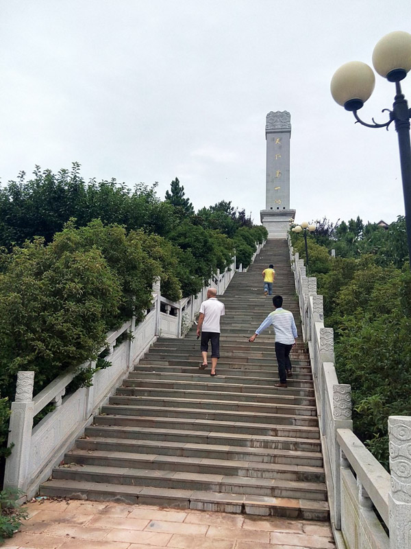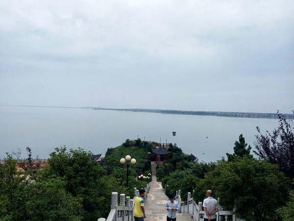 除了饒娥像,其對面的斗笠山也是美景所在之處。入山前,首先看到的是一條由青石板鋪成的臺階,臺階蜿蜒陡峭,兩側(cè)是漢白玉雕欄,欄上雕龍繪鳳,栩栩如生。抬頭仰望,只見臺階盡頭是一座高聳的石碑,燙金而書“天下第一碑”幾個大字。一路走走停停到了石碑前,眼前豁然開朗,放眼瞭望,到處一片茫茫水面,碧波蕩漾,翻起碎玉點點。窮極目力,水天一線之間,一座三角錐狀燈塔若隱若現(xiàn),“浩渺鄱湖水接天,波翻浪涌競爭先;連江通海胸懷廣,滋養(yǎng)生靈歲復(fù)年?!庇嗬系摹钝蛾栱灐氛\不欺我。臺階中央又有一小平臺,連接至一片紅墻黃瓦的走廊,廊前紅墻上鑲嵌著墨色的石板,上面刻著一些當(dāng)代大家對鄱陽湖的見聞和贊譽(yù),筆走龍蛇,字體蒼勁,令人賞心悅目之時不免肅然起敬。走下斗笠山,已經(jīng)接近傍晚,金日西斜,站在饒娥像后眺望,湖面一片金鱗銀濤,美如油畫。