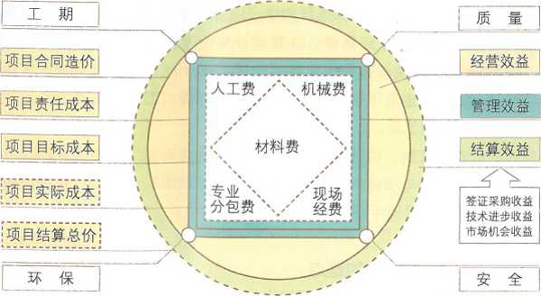 “方圓圖”是具有操作性的工具。其一,“方圓圖” 完整詮釋了建筑項(xiàng)目管理行為間的關(guān)系?!敖禹?xiàng)目”確定了合同造價(jià),對(duì)應(yīng)方圓圖的實(shí)線圓;“做項(xiàng)目”的第一步是下達(dá)項(xiàng)目目標(biāo)責(zé)任書,確定項(xiàng)目責(zé)任成本,對(duì)應(yīng)方圓圖的責(zé)任成本方形,第二步分子公司在責(zé)任書的基礎(chǔ)上進(jìn)行項(xiàng)目實(shí)施策劃,產(chǎn)生項(xiàng)目的目標(biāo)成本,對(duì)應(yīng)方圓圖的目標(biāo)成本方形,第三步就是項(xiàng)目實(shí)施過程的管控,最終確定實(shí)際成本,對(duì)應(yīng)方圓圖的實(shí)際成本方形?!八阗~收錢”就是完成項(xiàng)目過程中的結(jié)算變更與最后的決算收款,從而確定結(jié)算造價(jià),對(duì)應(yīng)方圓圖的結(jié)夢(mèng)造價(jià)虛線圓。項(xiàng)目實(shí)施過程中進(jìn)度、質(zhì)量、安全、環(huán)保及周邊相關(guān) 方的管理對(duì)應(yīng)成本方形的四個(gè)支撐頂點(diǎn),構(gòu)成成本的五項(xiàng)費(fèi)用“材料、人工、機(jī)械、現(xiàn)場經(jīng)費(fèi)、專業(yè)分包”對(duì)應(yīng)成本方形的內(nèi)部區(qū)域。