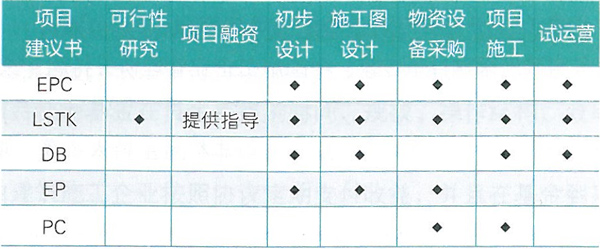 常見的工程總承包方式。工程總承包的主要方式有:設(shè)計(jì)采購(gòu)施工總承包(EPC )、交鑰匙工程總承包 (LSTK )、設(shè)計(jì)建造工程總承包(DB )、設(shè)計(jì)采購(gòu)總承包 (EP )、采購(gòu)施工總承包(PC )。不同的承包方式,參與項(xiàng)目實(shí)施過程中的不同環(huán)節(jié)(見表1 )。